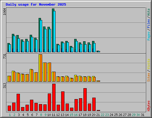 | Day | Hits | Files | Pages | Visits | Sites | KBytes | ||||||